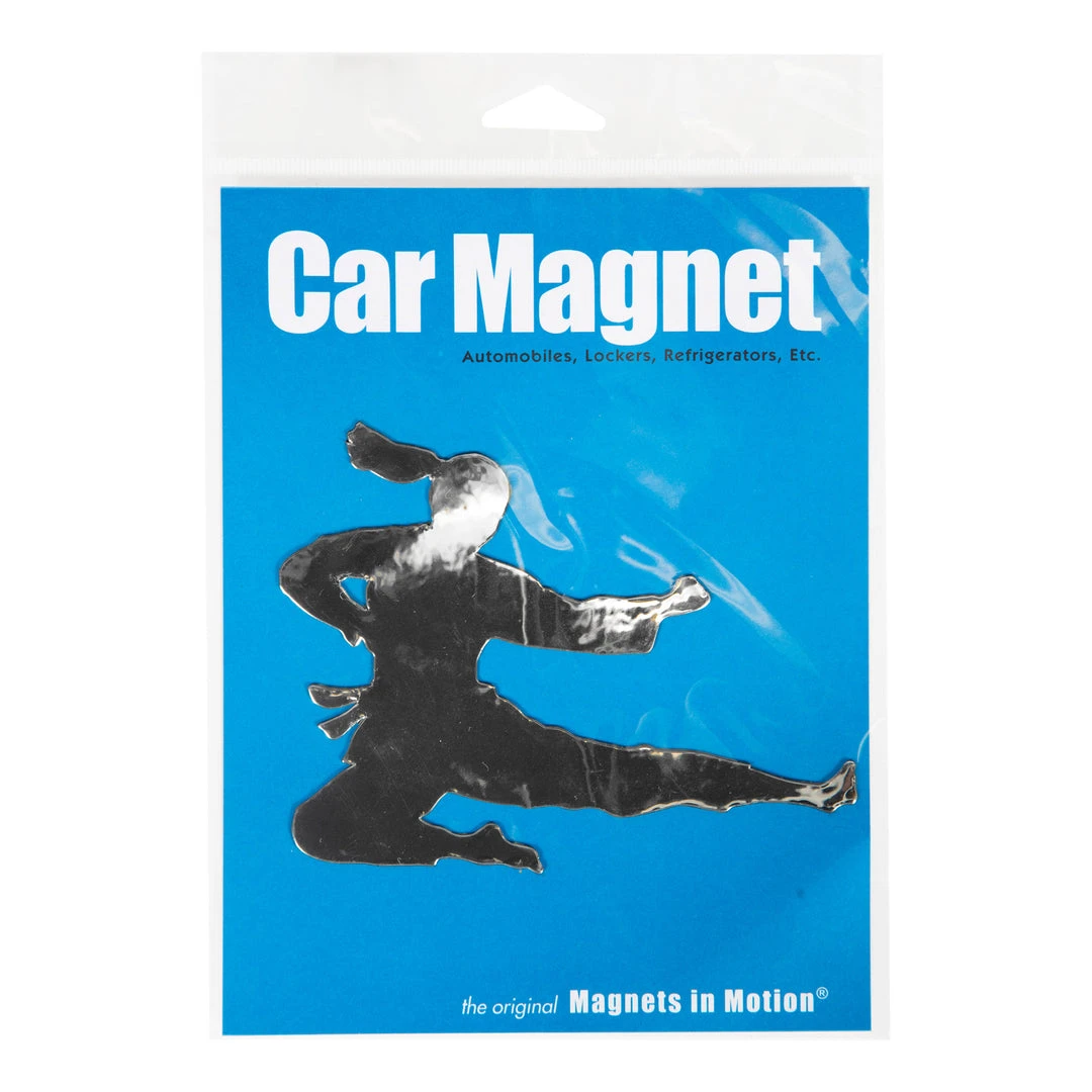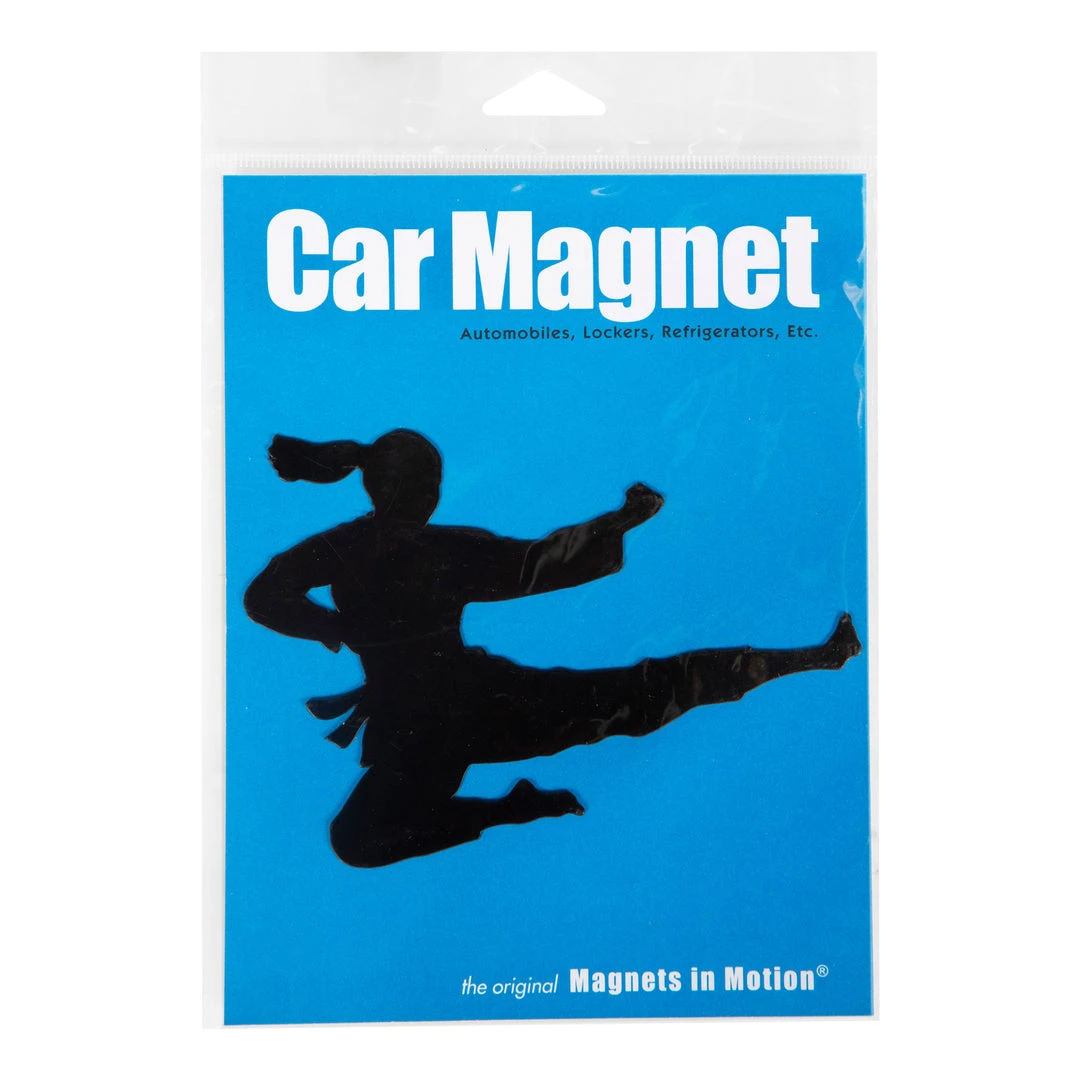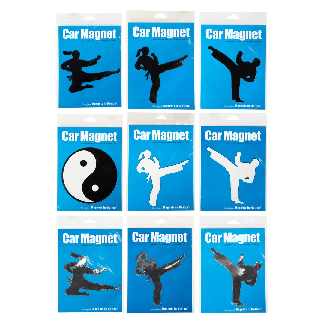 Display on vehicles, refrigerators, filing cabinets or metal desks. These magnets may be used over and over again. Female Jump Kick magnets measure 5 1/4” x 4”. Male Kicker magnets measure 4 3/4” x 5”. Female Kicker magnets measure 4 1/2” x 5”. Yin & Yang magnets measure 5” across.