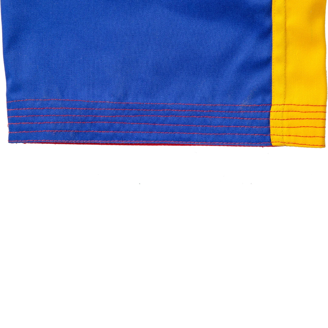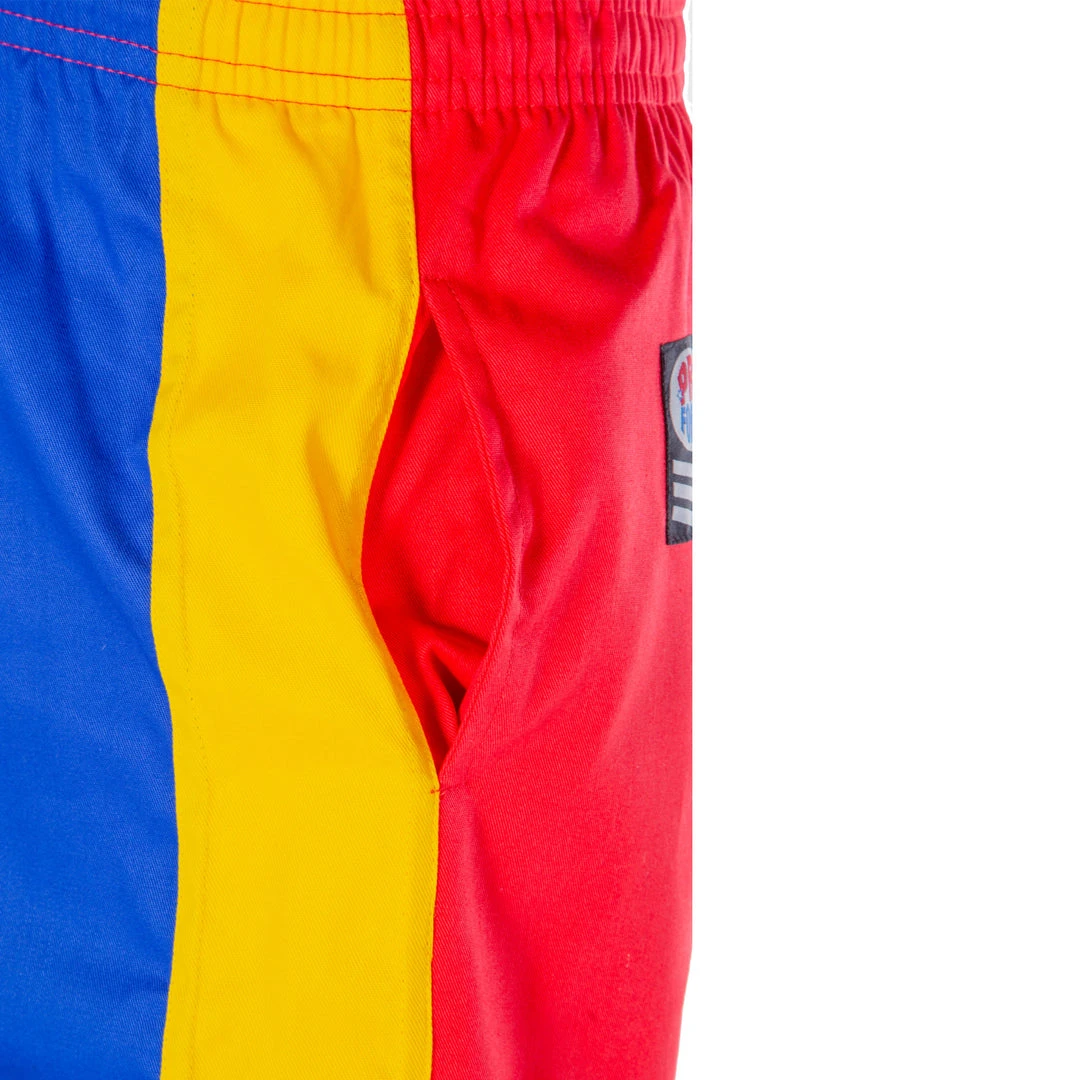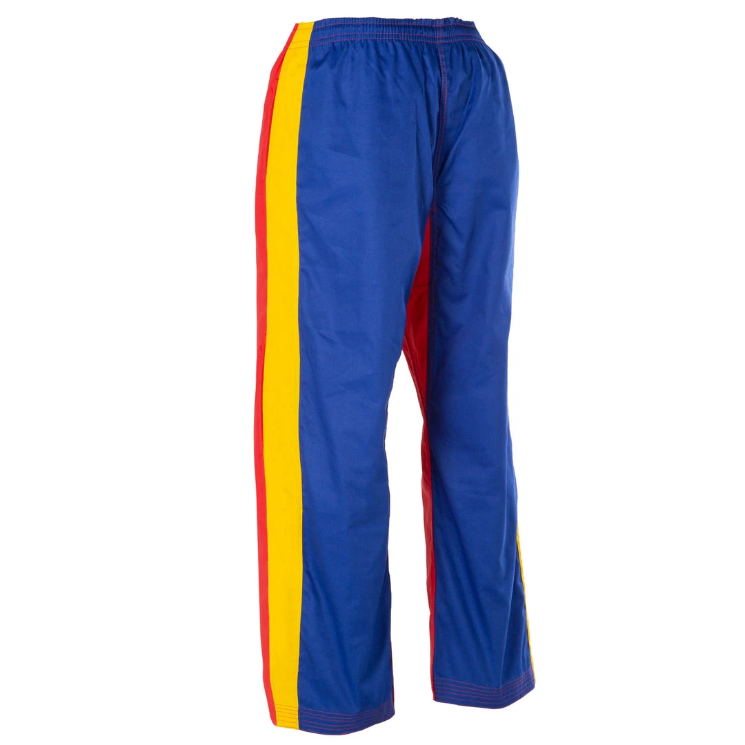 These 8 oz. medium weight karate pants with side pockets are made of a 55% cotton / 45% polyester blend and feature an elastic drawstring waist. Available with Red in the front, Blue in the back with Yellow down the side, and 4 sizes.