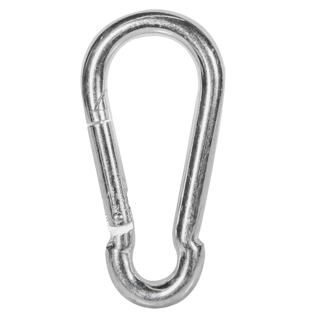 The carabiner hook is a steel spring loaded metal hook. This clip is designed to help hold up your heavy bags while training. This is necessary accesssory that allows for a simple easy transition when putting up and taking down your heavy bag. Size is 3.75” long x 1.75” wide.